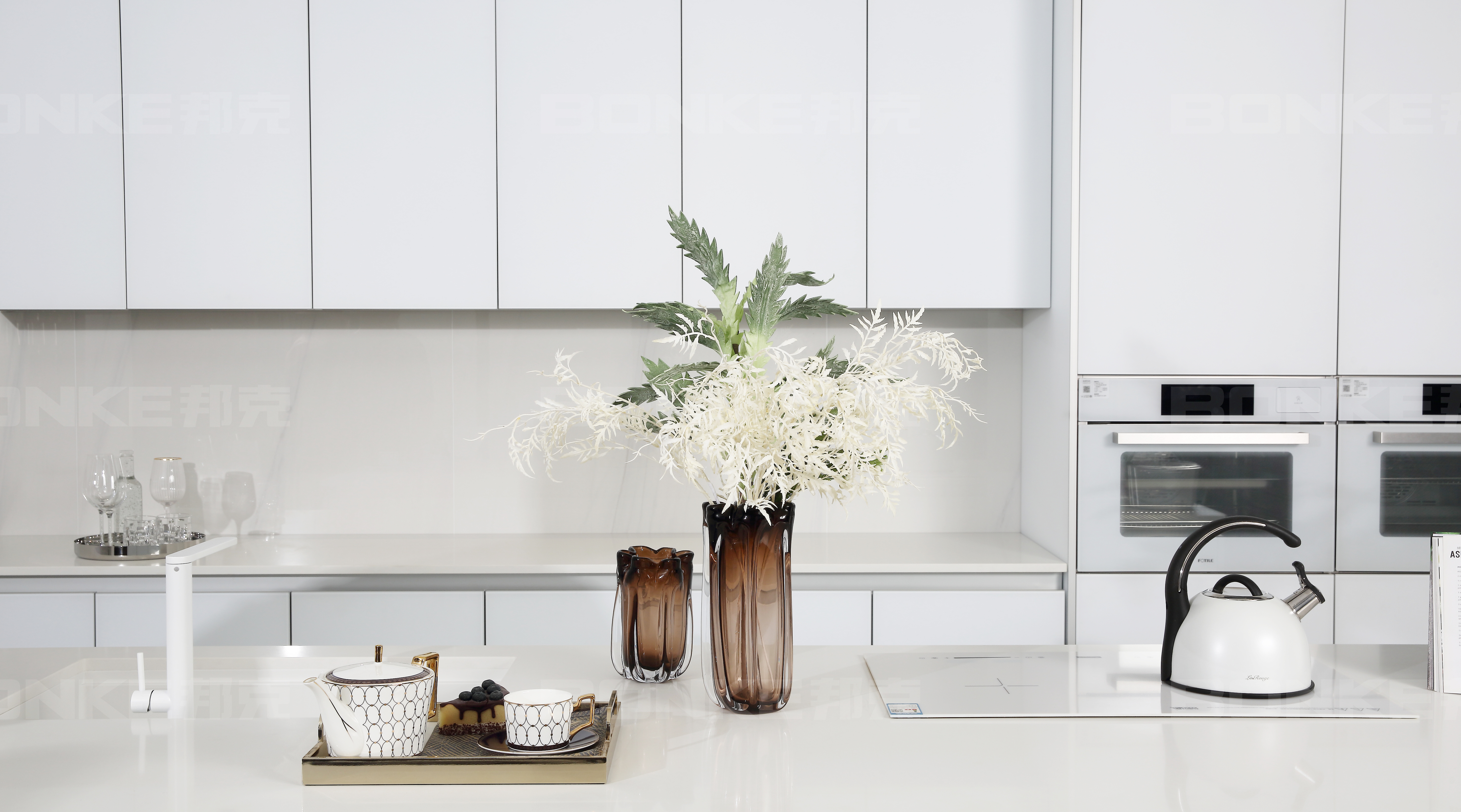 表面工艺 : 晶钻门板,超白哑面玻璃,银白型材,哑银地柜空手档,台下盆冰凝白石英石台面